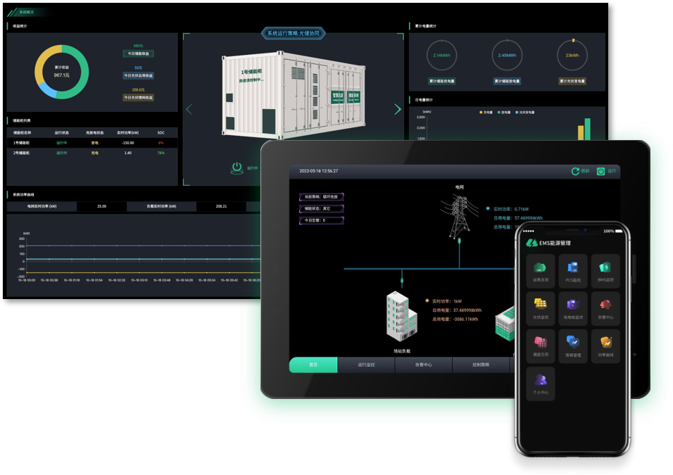 EMS系統從整個場站的視角展示源網荷儲能量流轉的實時情況,并聚合統計電網、負載、儲能、光伏以及充電樁等節點的實時功率和電量數據。該系統還支持顯示當前場站的運行策略、儲能電池的狀態以及系統的一次接線圖等信息。