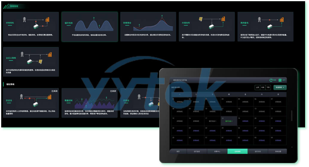 EMS系統支持全面的場站能源控制策略,包括并網待機、循環充放、削峰填谷、光儲協同、離網備電、自定義策略、防逆流、防孤島運行、以及需量控制等。場站可以根據自身需求、當地電價策略以及實際生產用電情況,按天設置相應的控制策略。同時,系統支持連接云涌VPP運營管理系統,接收虛擬電廠平臺下發的需求響應策略并執行。