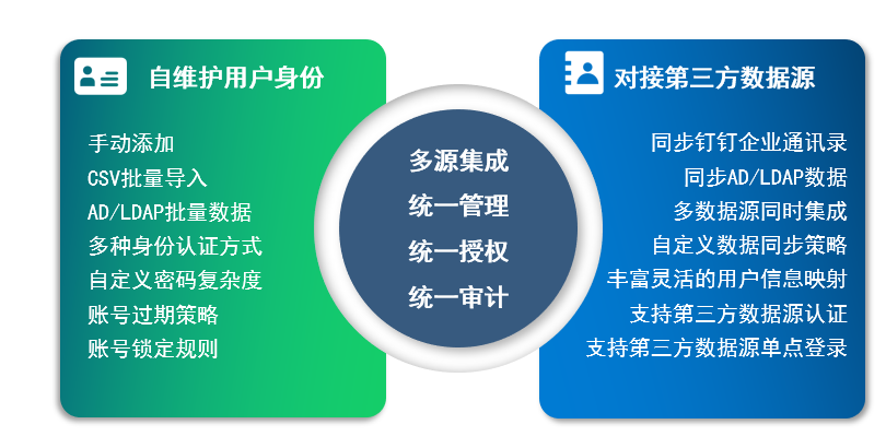 云涌零信任安全管理平臺既支持主流企業通訊錄系統的數據導入與同步,也支持自建用戶體系。實現了在一個平臺對企業人員、部門以及角色組的統一高效管理。同時系統提供多種用戶認證方式,全方位滿足各種需求場景。
