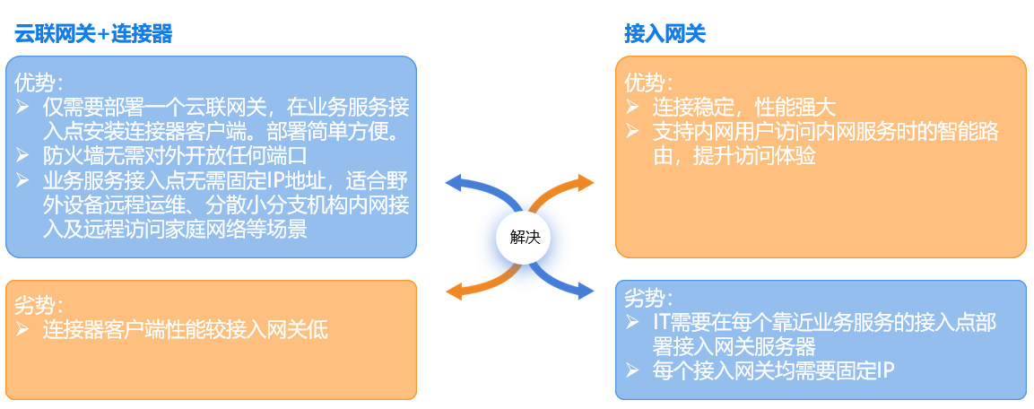 云涌遠(yuǎn)程辦公解決方案支持兩種內(nèi)網(wǎng)訪問(wèn)模式:基于接入網(wǎng)關(guān)的訪問(wèn)代理,以及基于云聯(lián)網(wǎng)關(guān)+連接器的內(nèi)網(wǎng)穿透。客戶可以根據(jù)自身IT架構(gòu)及實(shí)際需求選擇適合的服務(wù)訪問(wèn)模式。兩種模式可以同時(shí)存在。