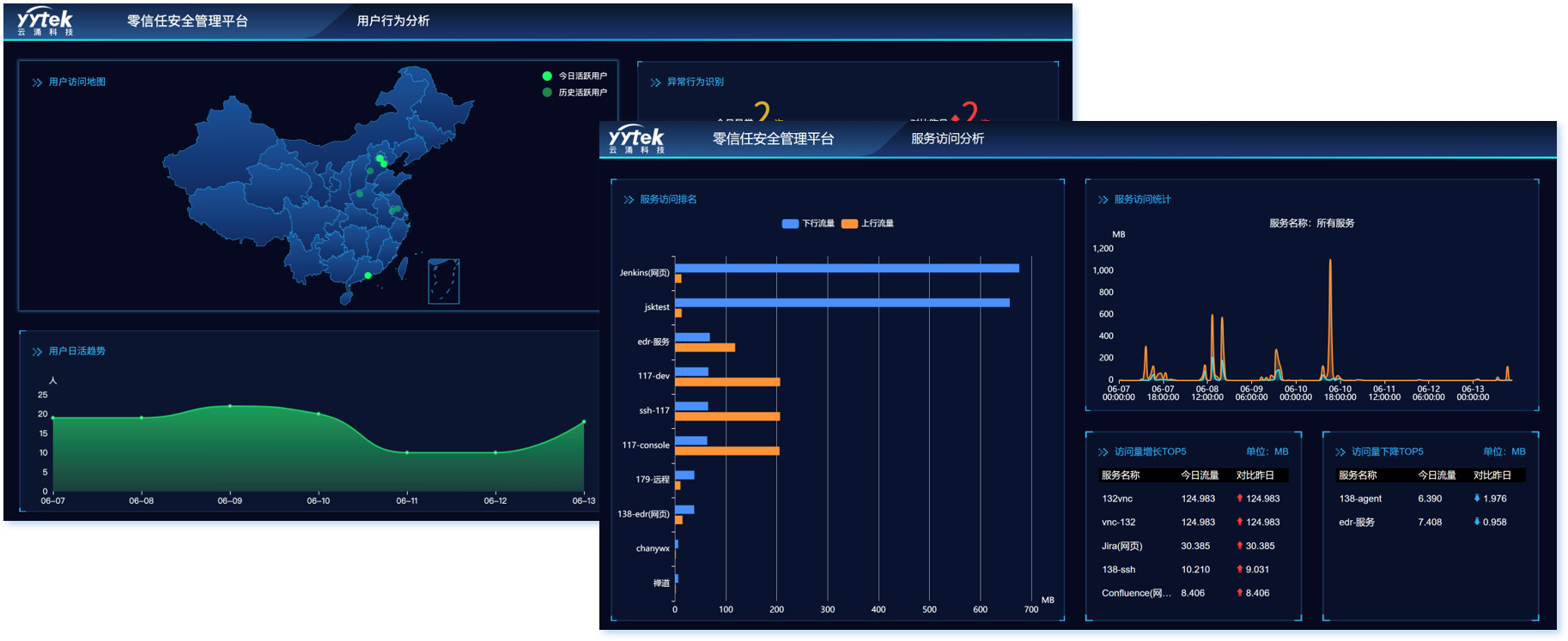 方案提供了用戶使用行為的態(tài)勢(shì)分析以及服務(wù)訪問(wèn)態(tài)勢(shì)分析,通過(guò)態(tài)勢(shì)大屏展示方便日常管理及領(lǐng)導(dǎo)審閱。