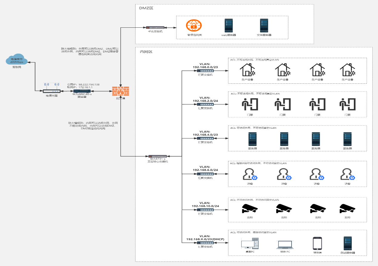 ? ? ? 其次,為了解決內(nèi)網(wǎng)安全隱患,根據(jù)業(yè)務(wù)類型和部門劃分不同的VLAN,各VLAN之間的通過(guò)ACL策略進(jìn)行合理的訪問(wèn)控制。同時(shí)建立DMZ區(qū),DMZ區(qū)用來(lái)放置必須公開(kāi)的服務(wù)器資源(如企業(yè)Web服務(wù)器、文件服務(wù)器、論壇等)和零信任網(wǎng)關(guān),外網(wǎng)、DMZ和內(nèi)網(wǎng)之間通過(guò)防火墻進(jìn)行隔離。