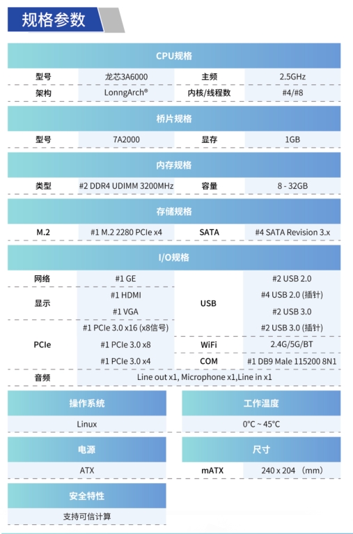 由云涌科技推出的基于3A6000的系列產(chǎn)品,采用4核處理器構(gòu)建,主頻2.5GHzo,搭配7A2000橋片,1GB獨立顯存,支持2路UDIMM3200DDR4內(nèi)存條,支持M.2接口,可作為小容量固態(tài)系統(tǒng)盤使用,應用于家用娛樂、商務辦公等場景。