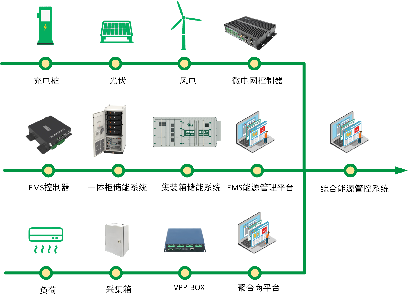 底層硬件——一體柜EMS控制器、微電網(wǎng)控制器、VPPBOX、規(guī)約轉(zhuǎn)換器、采集器、負荷控制器等。